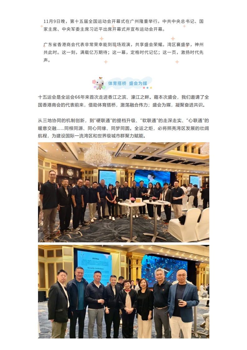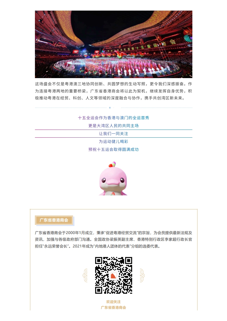 11月9日晚,第十五届全国运动会开幕式在广州隆重举行。广东省香港商会代表非常荣幸能到现场观演,共享盛会荣耀...