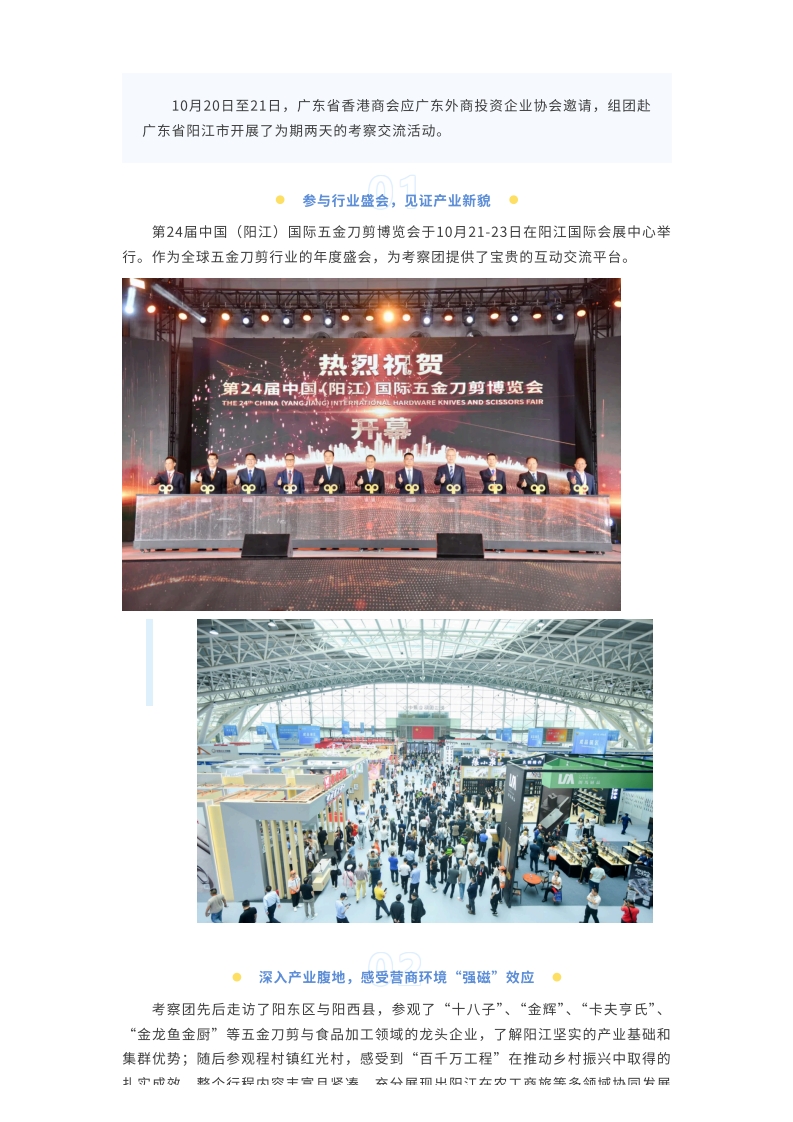 10月20日至21日,广东省香港商会应广东外商投资企业协会邀请,组团赴广东省阳江市开展了为期两天的考察交流活动...