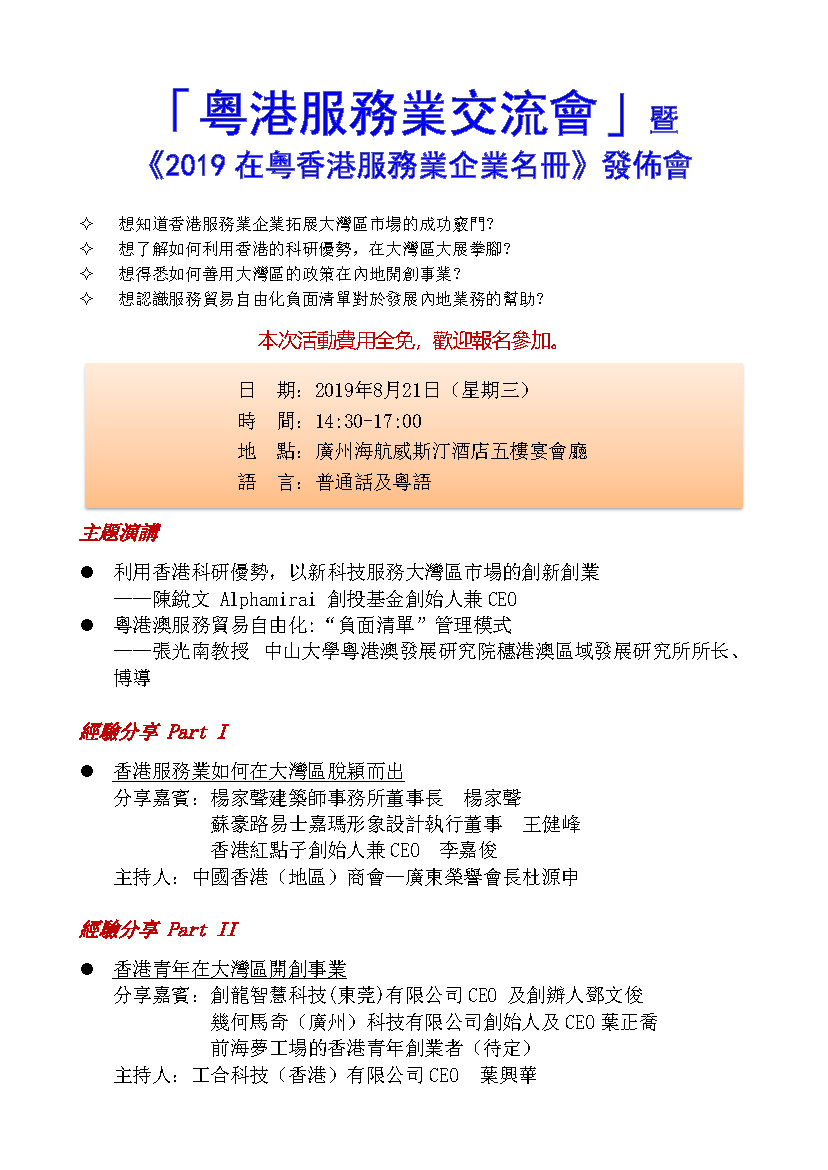 想知道香港服务业企业拓展大湾区市场的成功窍门?想了解如何利用香港的科研优势?欢迎报名参加此次活动...